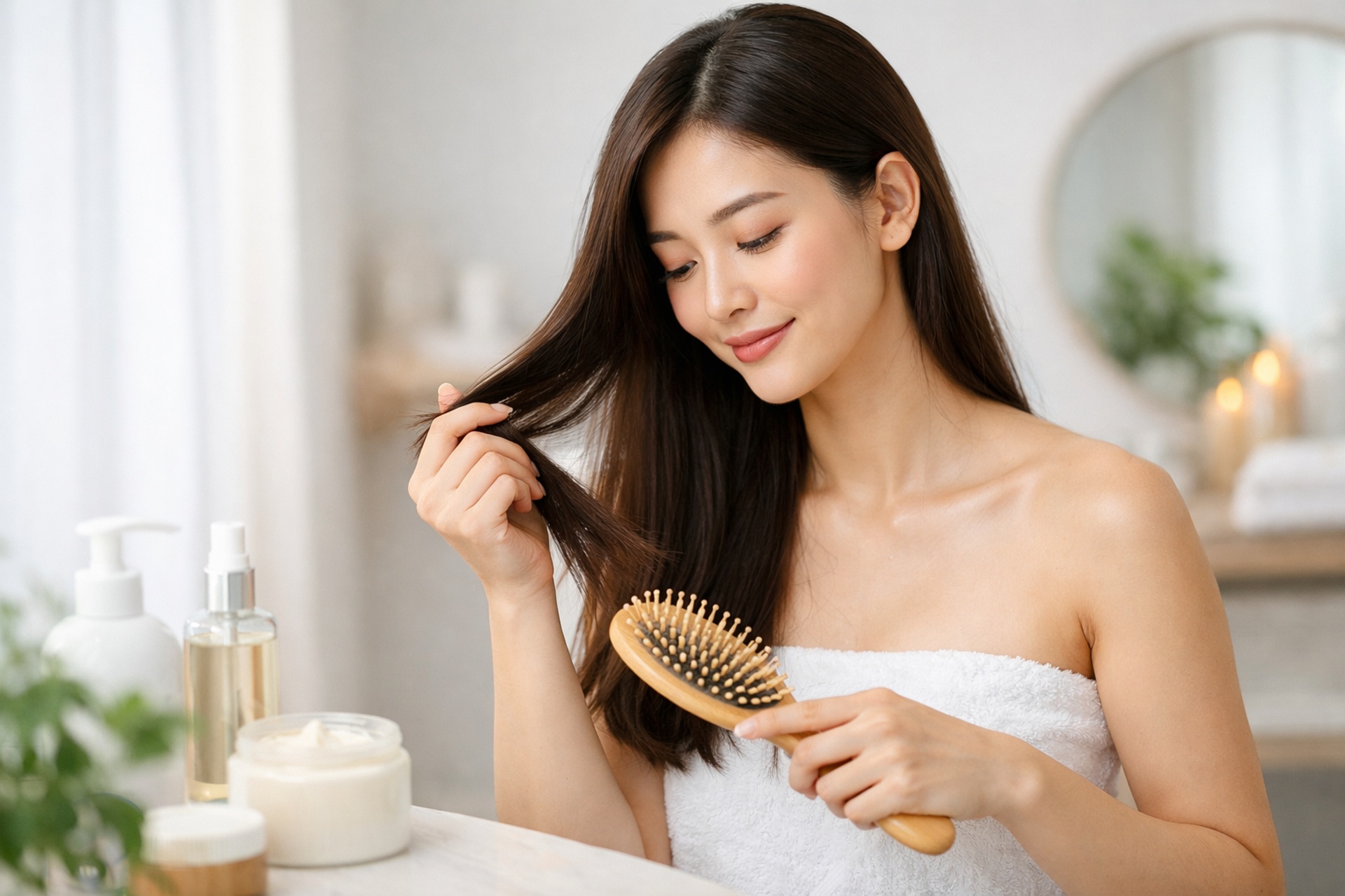 もつれや絡まりがある場合は先に指でほぐし、手櫛で引っ掛かりがないことを確認してからブラッシングします。ロングヘアの場合は毛先から梳かし、それから生え際の方へと移るとスムーズにケアできます。